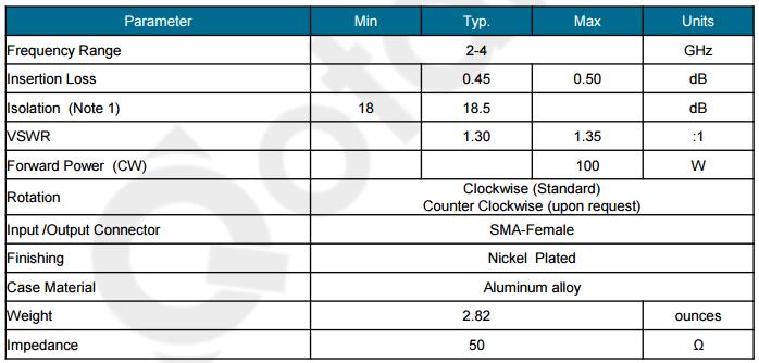Ultra Wide Band Coaxial Circulator 2-4GHz DBCL1802000400G